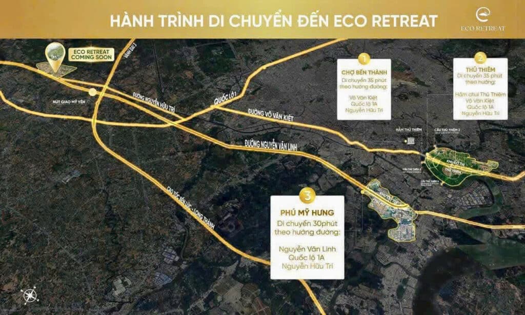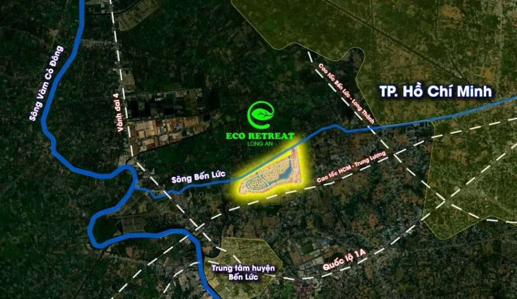 Ecopark Long An có vị trí chiến lược tiếp giáp với trục cao tốc TP Hồ Chí Minh – Trung Lương, giúp dễ dàng di chuyển đến các địa điểm quan trọng. Nằm cách trung tâm thành phố Hồ Chí Minh chỉ 18km, Eco Retreat mang đến sự linh hoạt và đa dạng trong lựa chọn phong cách sống.